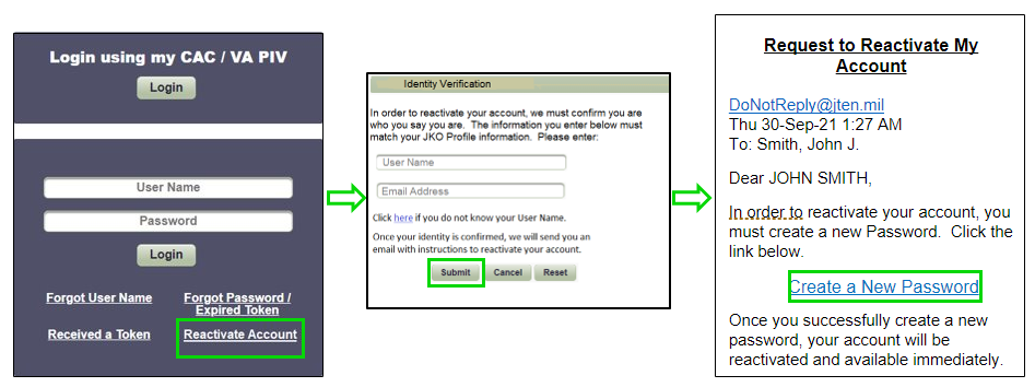 The new reactivate account link appears on the JKO login page. Enter your JKO username and email address saved in your profile to receive instructions to verify your account for reactivation.