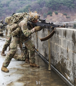 Rodriguez Live-Fire Complex - Soldiers use suppressing fire during a force-on-force exercise at Rodriguez Live-Fire Complex in South Korea, April 6, 2018. Army photo by Spc. Elizabeth Brown